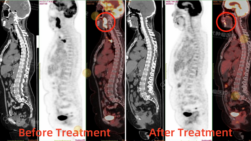 После четырёх сеансов лечения моя тётя прошла повторное ПЭТ-КТ, которое показало значительное уменьшение опухоли ротоглотки. Первоначальная опухоль размером 4,3 x 3,9 см уменьшилась до 1,7 x 1,8 см, а часть опухоли даже исчезла. Значение SUV-метаболизма снизилось с 26,4 до 7,2, что значительно снизило активность опухоли. В других метастатических зонах также наблюдалось значительное улучшение. Эти результаты были невероятно обнадеживающими. Выздоровление тёти шло на поправку. У неё не только улучшился цвет лица, вернулся аппетит, она начала набирать вес, но и стала более жизнерадостной и разговорчивой.