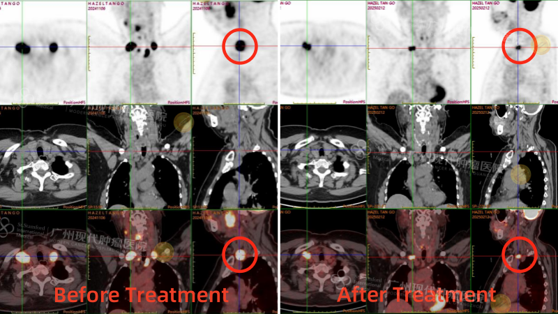 В то время мы изучали медицинские заключения моей тёти. У неё были увеличены лимфатические узлы по всему телу, самый большой из которых был размером примерно 3,3 х 2,6 см. Опухоль в ротоглотке достигла 4,3 х 3,9 см, перекрывая почти 80% дыхательных путей. Ей было не только трудно глотать, но и постепенно ухудшалась речь. Врач прямо заявил, что если она промедлит ещё немного, то, возможно, даже не сможет дышать самостоятельно. Слова врача повергли нас в отчаяние, и я инстинктивно посмотрела на мужа. Девять лет назад, когда у моего свекра диагностировали рак прямой кишки, мы пережили тот же момент отчаяния. Мы случайно узнали о малоинвазивном комплексном лечении, предлагаемом в Современной онкологической больнице Гуанчжоу, и, отчаявшись, отправились на лечение. Это фактически спасло мою тётю от тени рака. Глядя на КТ тёти, я задавалась вопросом, может ли та же технология помочь ей бороться с раком с меньшим риском.